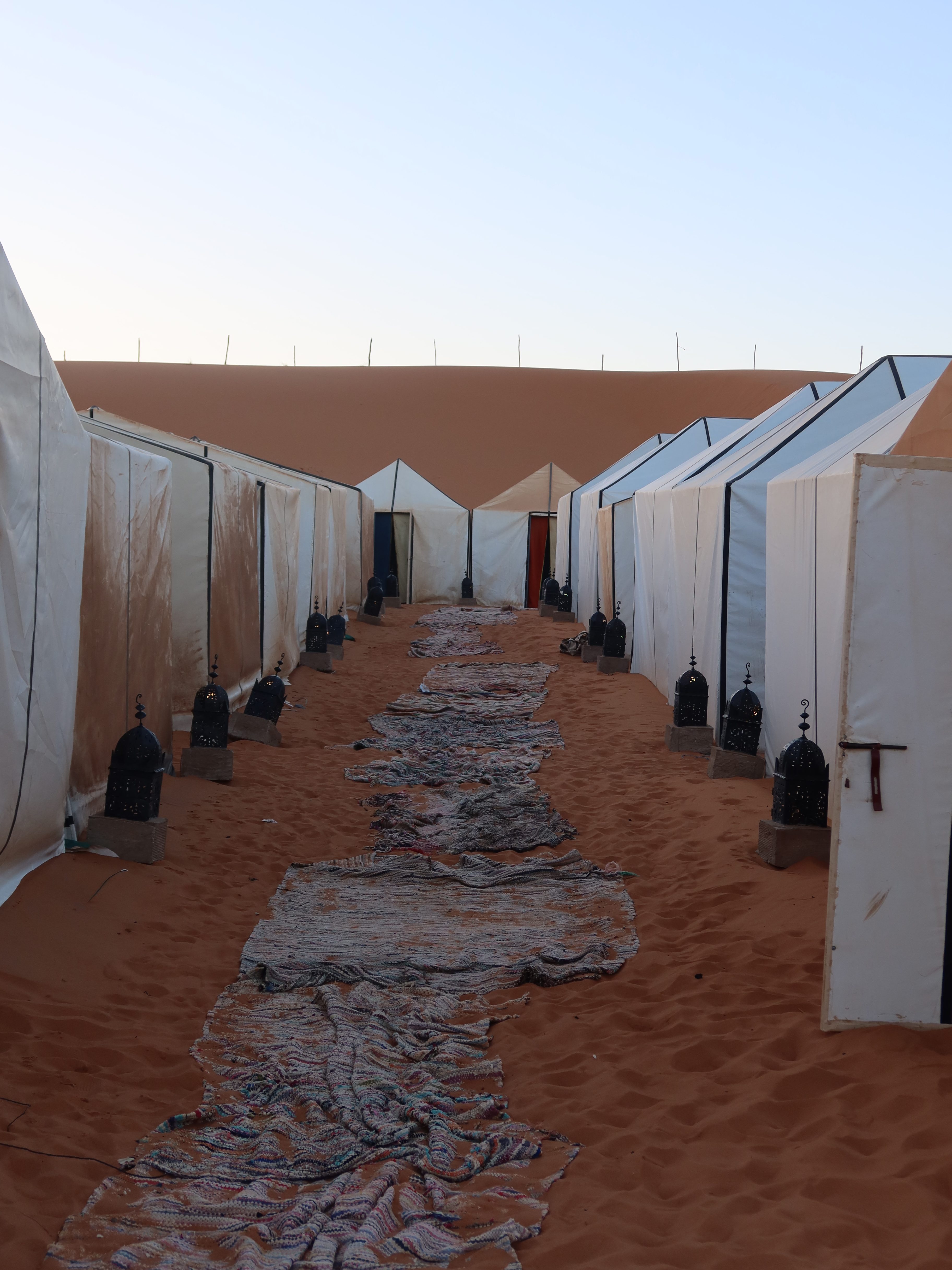- Merzouga Desert Camp: After receiving our assigned campsite, we had some time to unwind before sunset. Once the sun dipped below the horizon, we gathered to enjoy dinner in a tent, which turned out to be quite tasty, with vegetarian options available. Following dinner, we savored some Moroccan mint tea while listening to and dancing to live Berber music and drumming before heading off to bed.